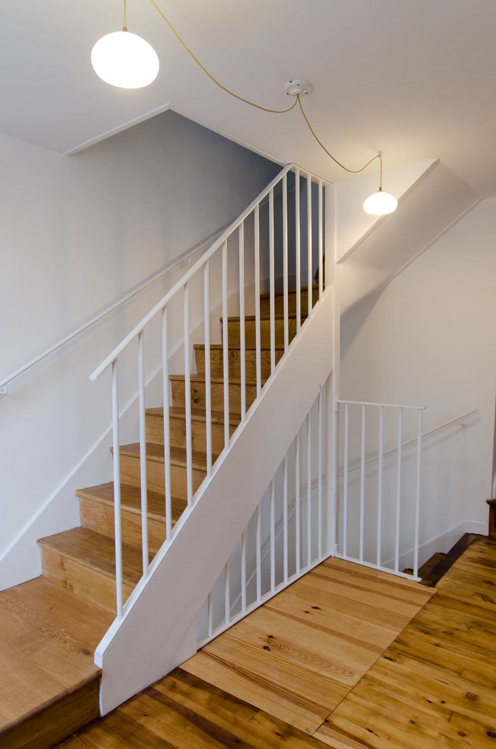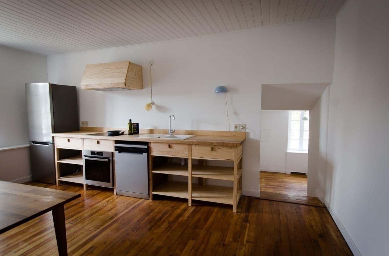 Chaque espace a fait l’objet d’un réagencement complet avec la création de nombreuses cloisons, alliant fonctionnalité et cohérence architecturale. Les menuiseries réalisées sur mesure par PACKM occupent une place centrale dans ce projet : escalier en chêne massif, bibliothèques, bar, caches radiateurs, cuisine, tablettes de fenêtres… jusqu’aux fenêtres elles-mêmes, tout a été conçu avec précision et dans le souci du détail.