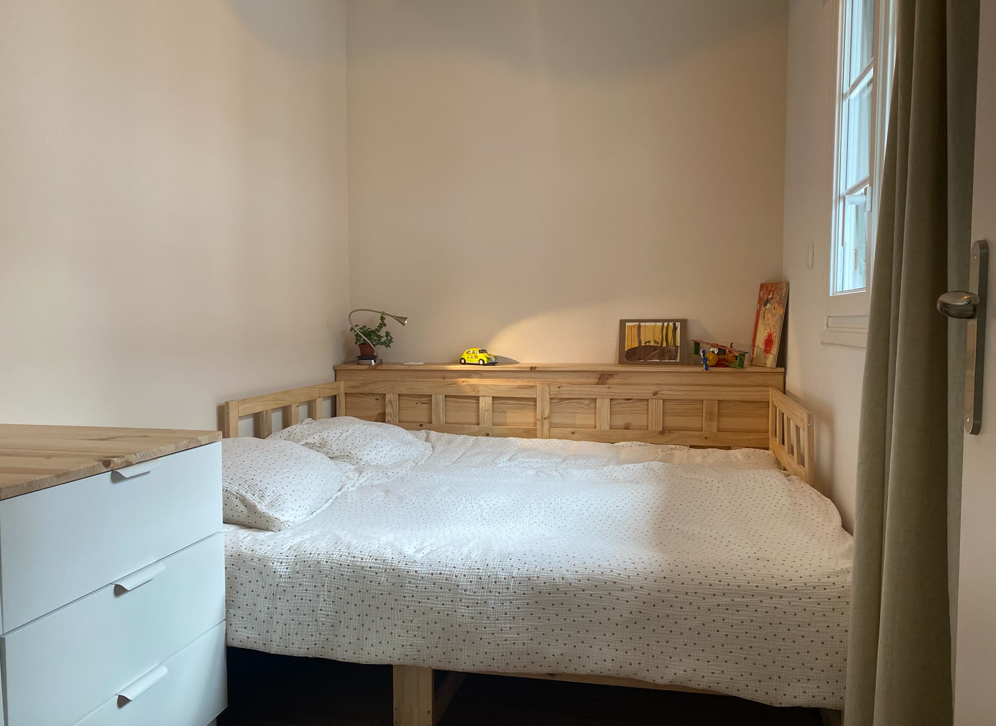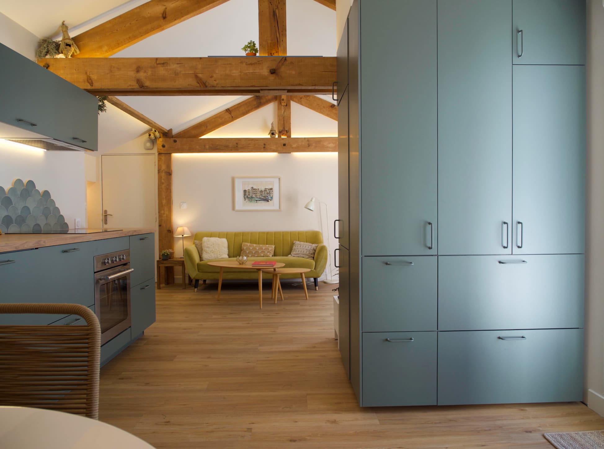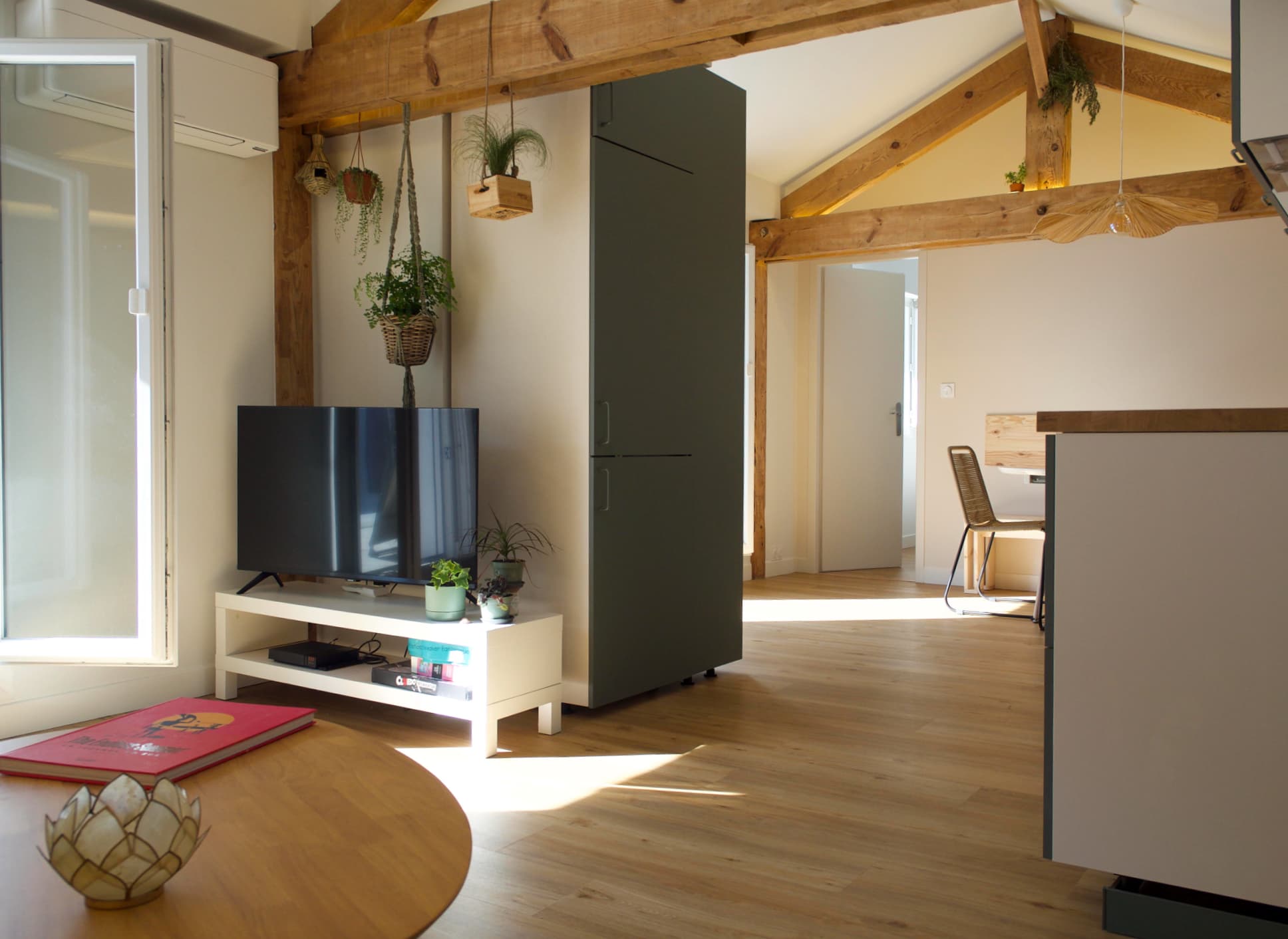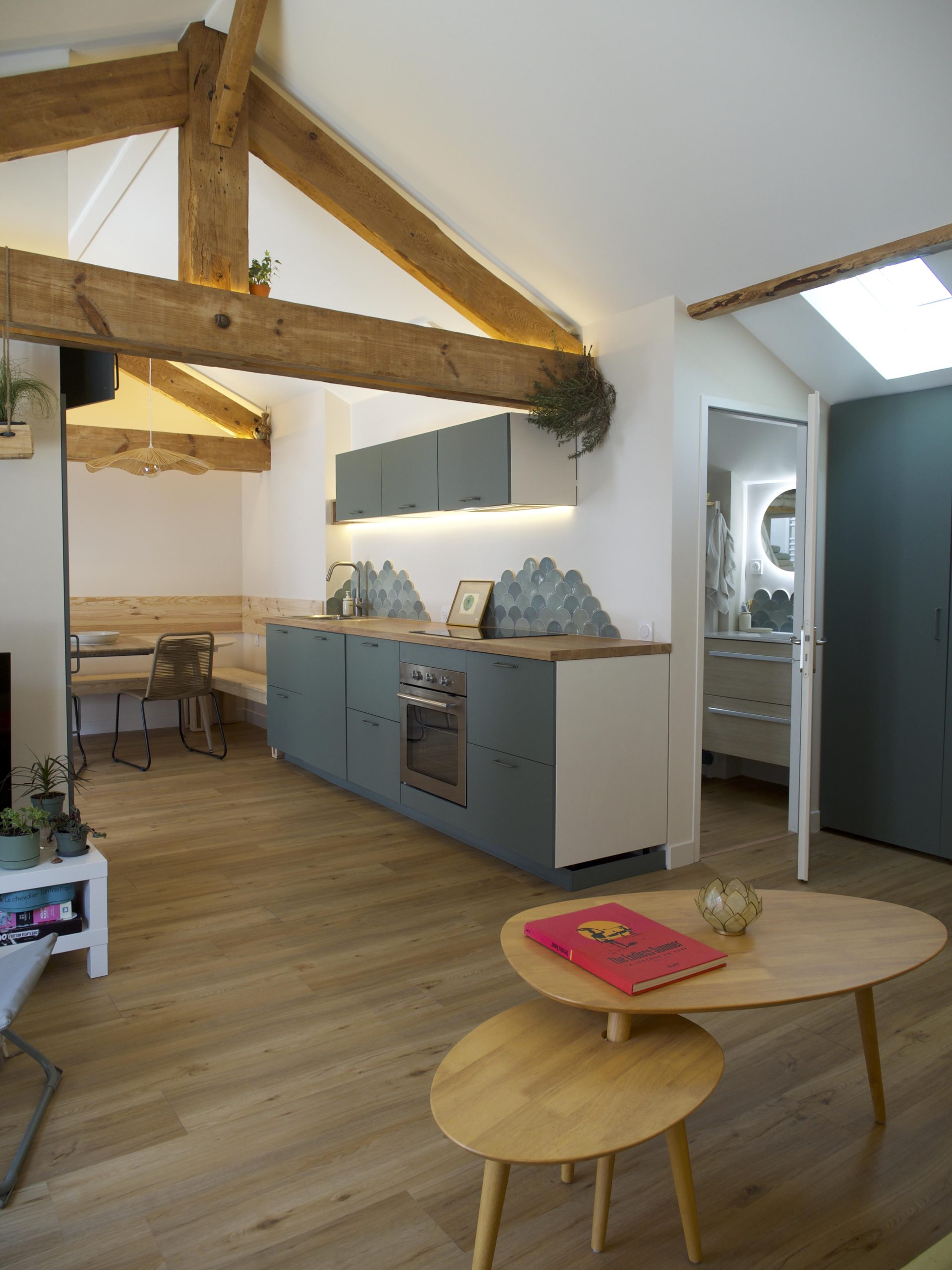 Enfin, une intervention soignée sur les finitions intérieures a permis de révéler toute l’identité de cet appartement. Grâce à un travail précis sur les volumes et les matériaux, les fermes de la charpente ont été sublimées, conférant au lieu un charme authentique. Confort, esthétique et respect du caractère architectural s’y conjuguent avec élégance.
