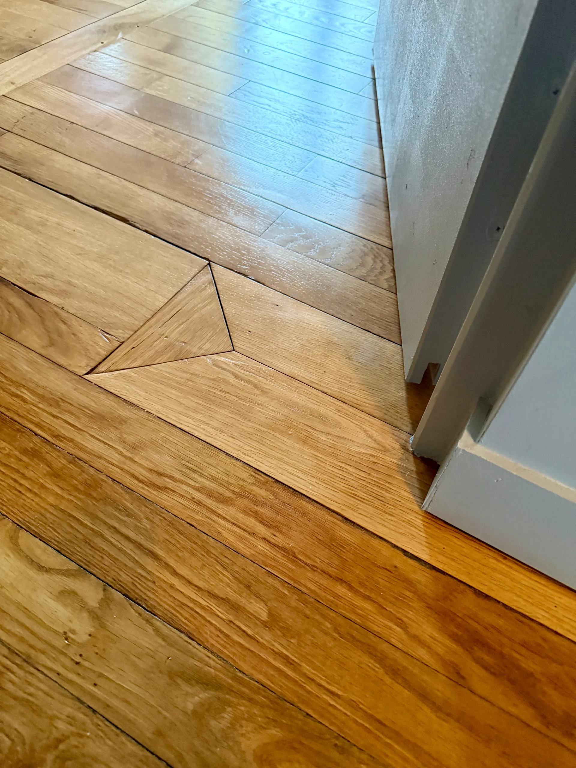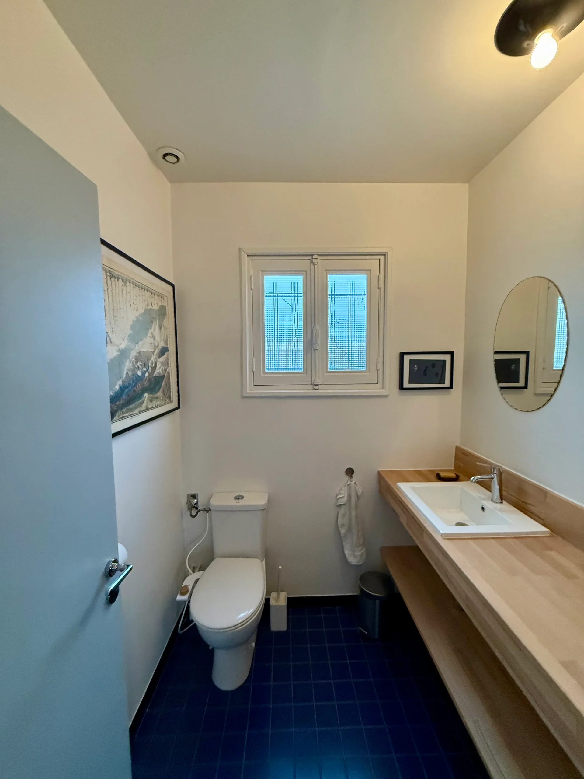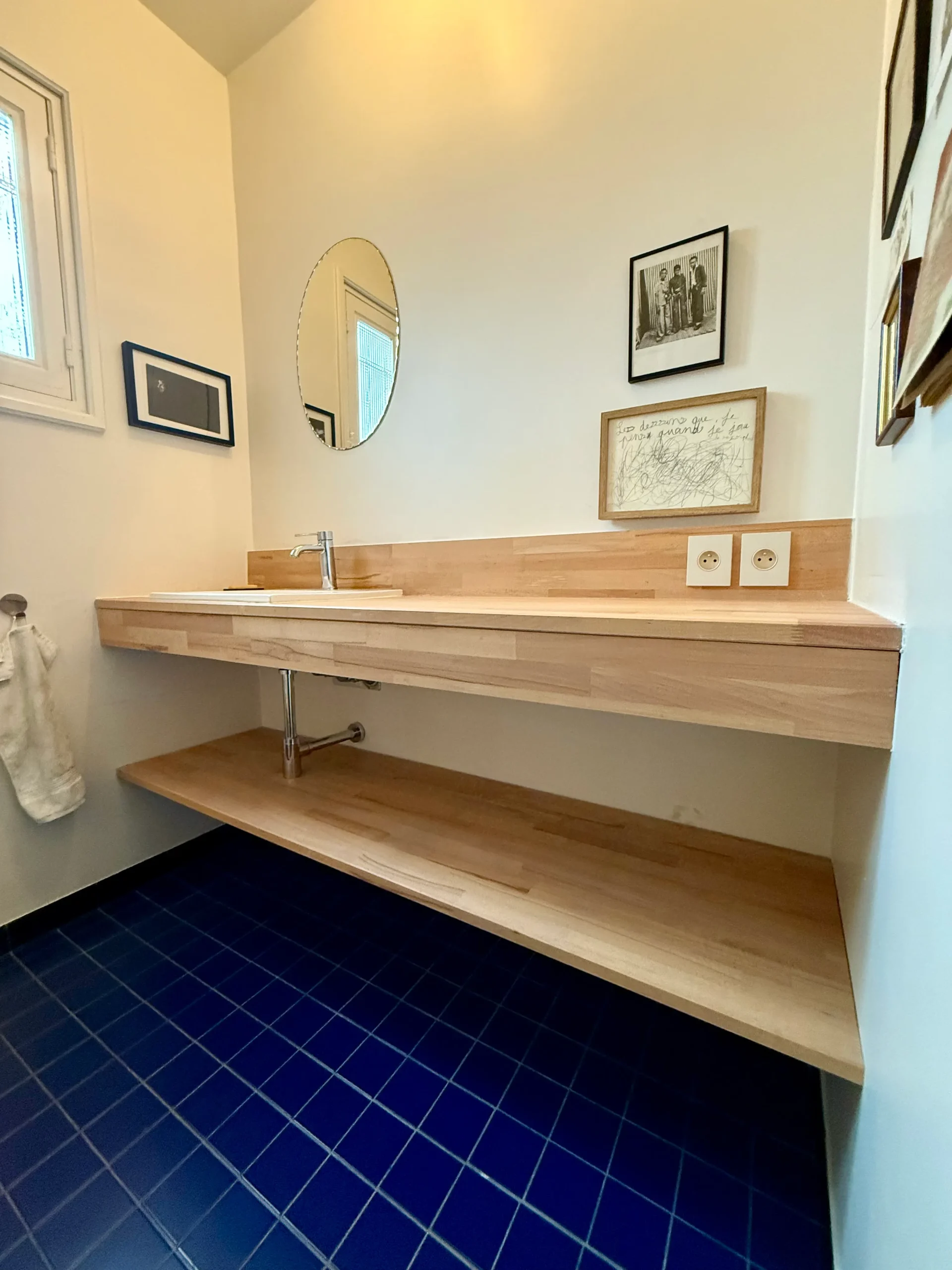 Le sol en chêne massif a été complété pour respecter la trame de l’ancien. Des menuiseries sur mesure — dressing, plans de vasque et niche de baignoire — optimisent les volumes. Le projet intègre également une nouvelle trappe d’accès au grenier pour une fonctionnalité totale.