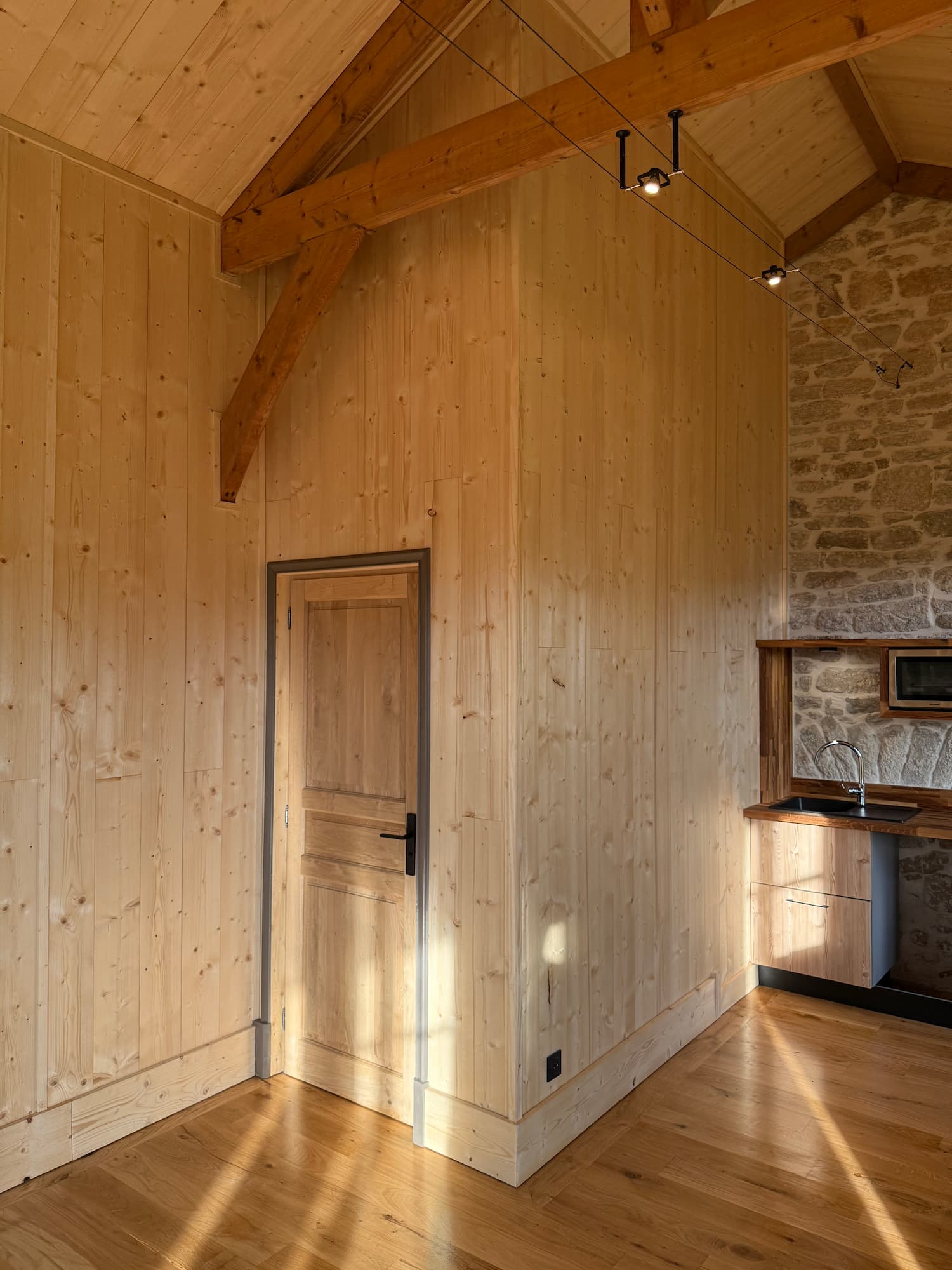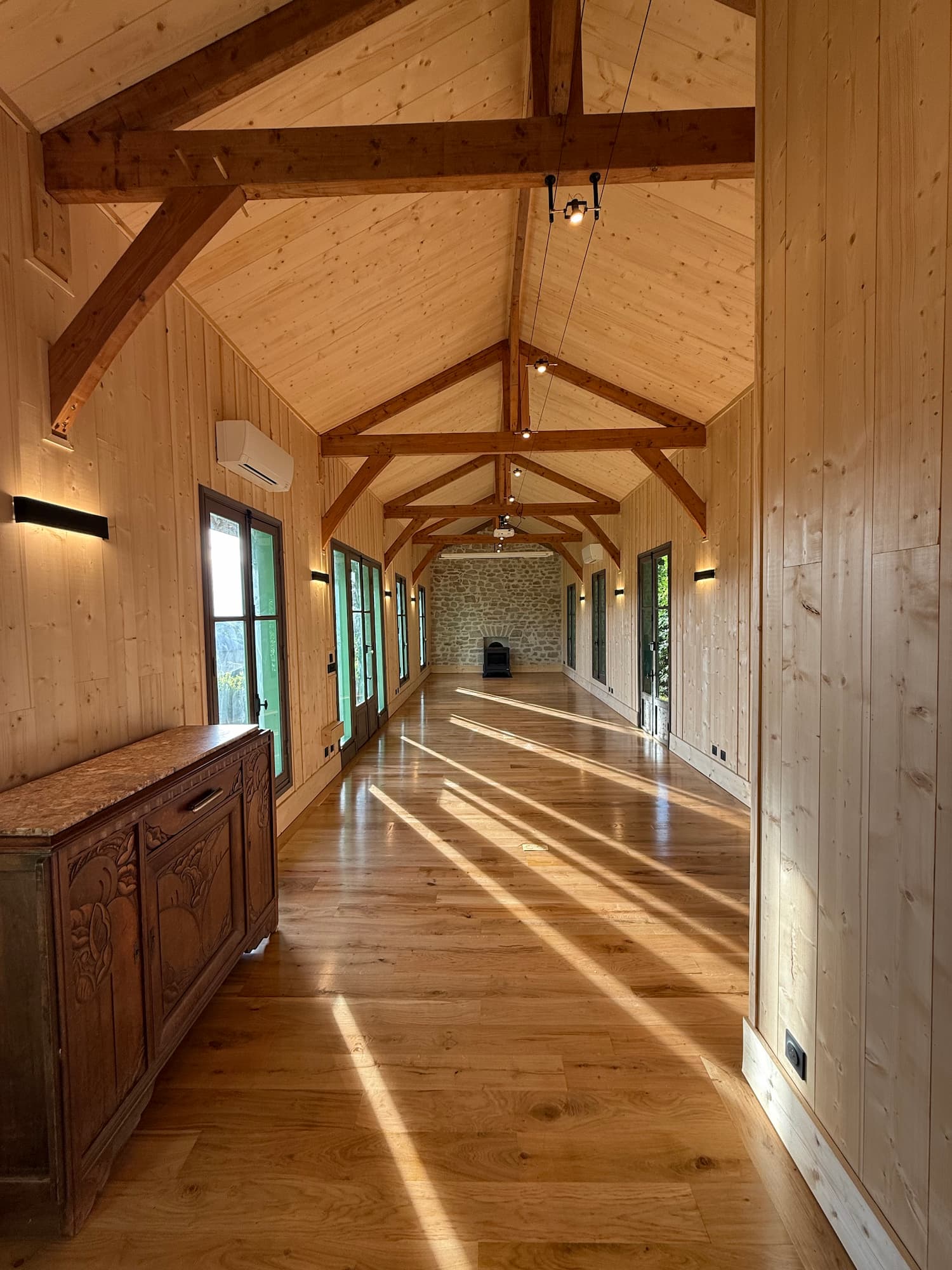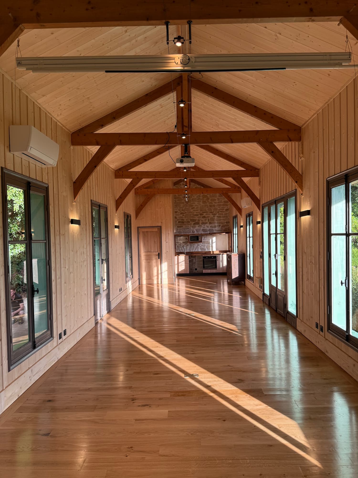Une isolation en laine de bois, respectueuse de l’environnement, a été mise en place, accompagnée d’un habillage extérieur en bardage identique à l’ancien et de lambris intérieur. Un parquet en chêne massif a été posé, et la panne principale de l’avant-toit a été remplacée pour sécuriser l’ensemble.