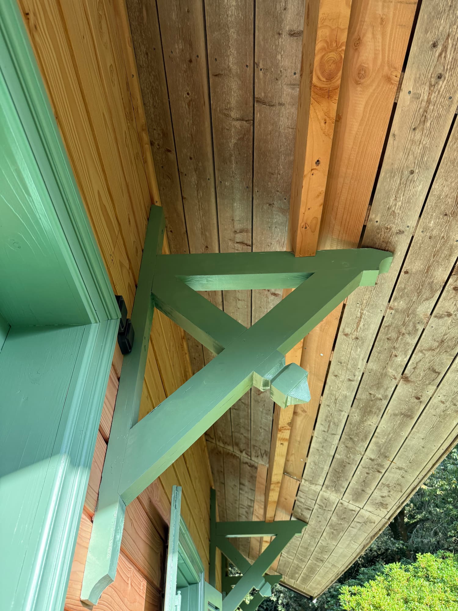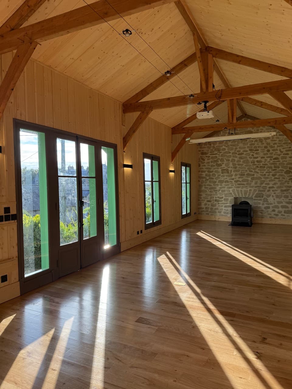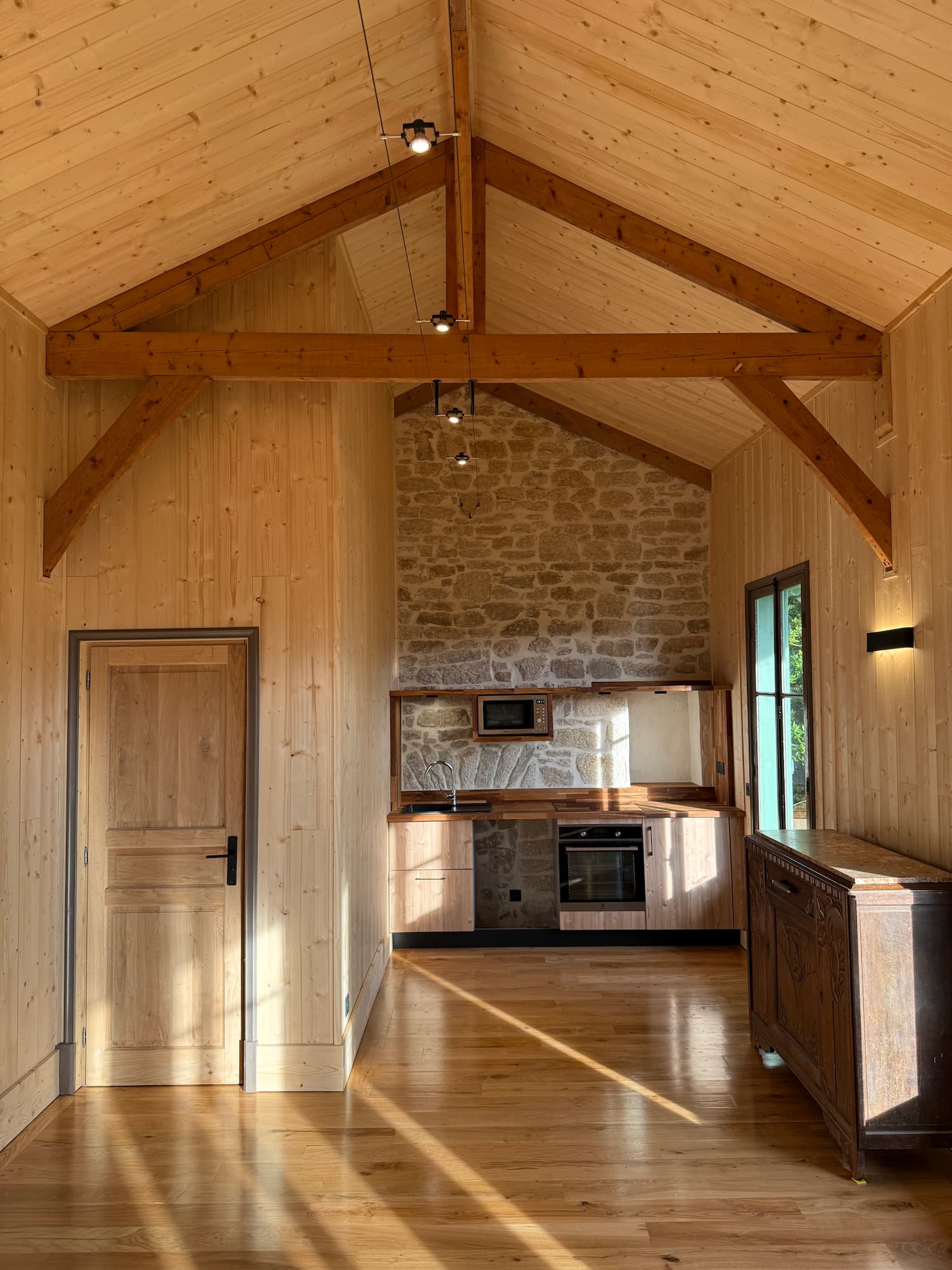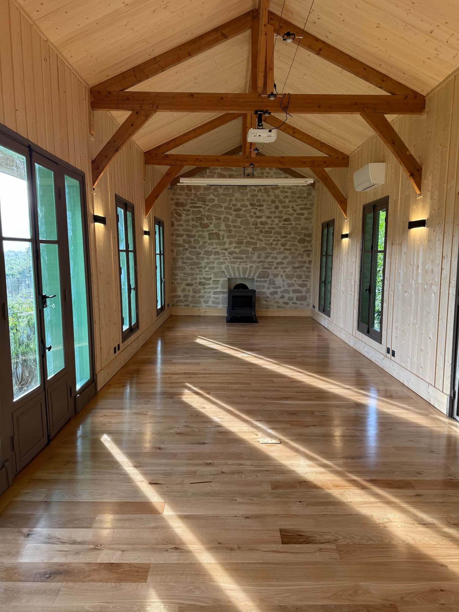 Une isolation en laine de bois, respectueuse de l’environnement, a été mise en place, accompagnée d’un habillage extérieur en bardage identique à l’ancien et de lambris intérieur. Un parquet en chêne massif a été posé, et la panne principale de l’avant-toit a été remplacée pour sécuriser l’ensemble.