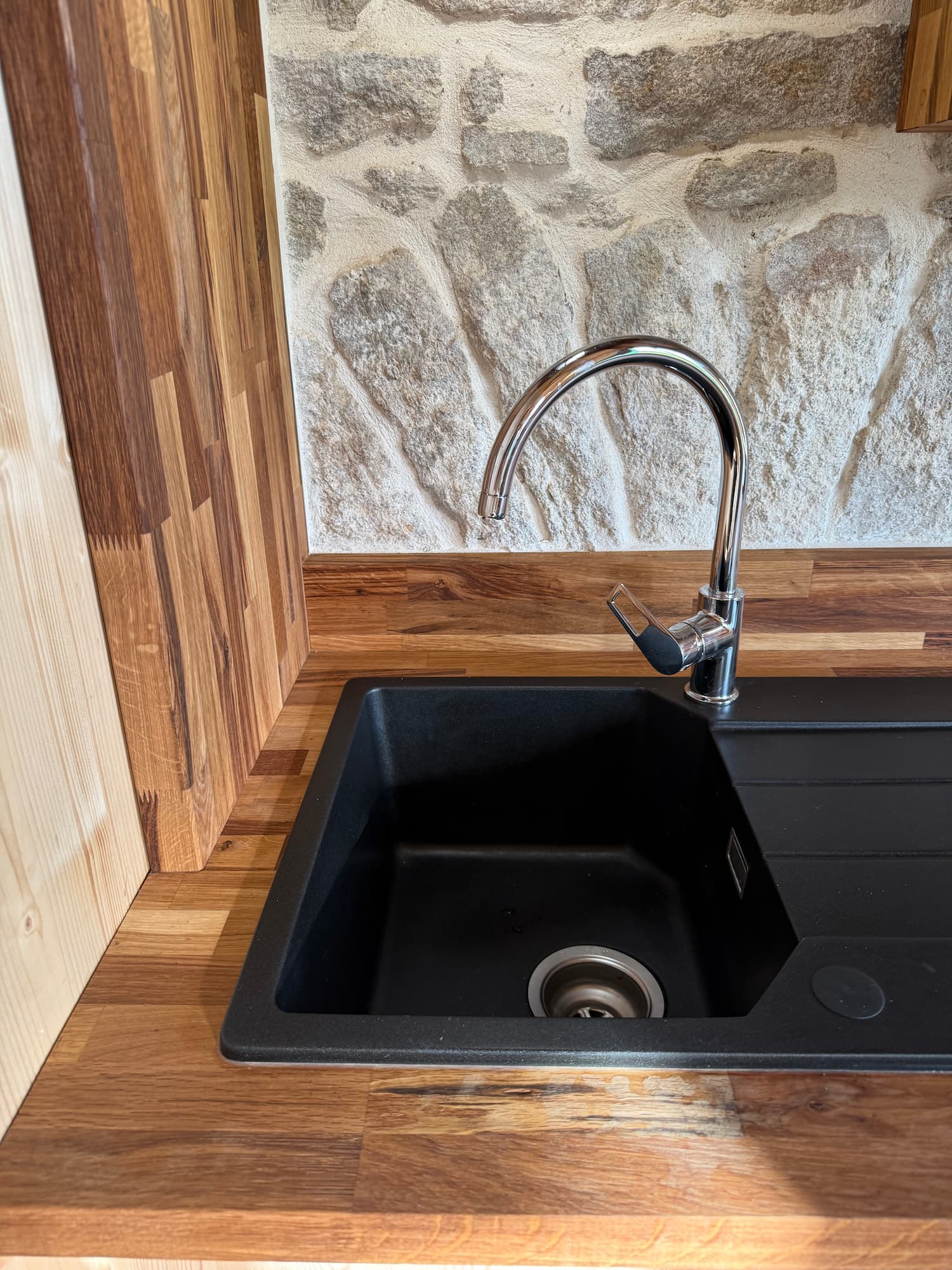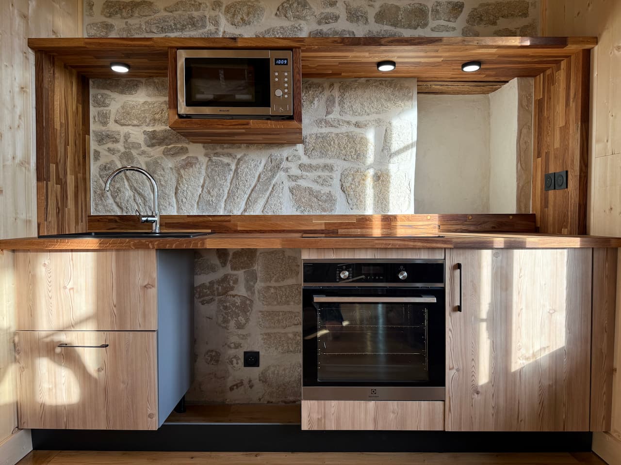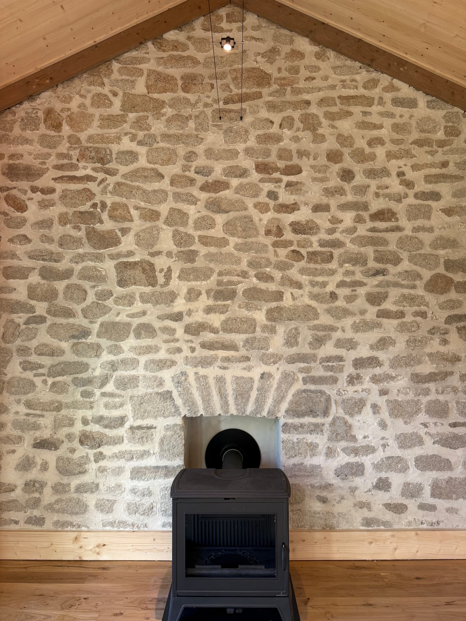 Les éléments emblématiques – portes, volets, fenêtres, moulures, équerres et murs en pierre – ont été soigneusement restaurés. L’intervention a également permis la création d’une cuisine et d’un espace sanitaire, l’ajout de deux fenêtres fixes pour apporter plus de lumière, ainsi que l’installation d’un poêle pour renforcer le confort.